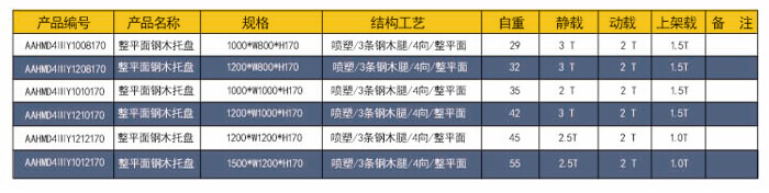 四向三腿——整平面鋼木托盤 技術參數說明: 產品編號:AAHMD4ⅢY1512170 產品規(guī)格: 1500*1200*170 防銹工藝: 靜電銀粉沙紋噴塑 產品靜載: 2000KG(均勻載重) 產品動載: 2000KG(均勻載重) 產品上架: 1500KG(均勻載重) 主要用途: 倉庫、車間周轉、高庫物流及倉儲